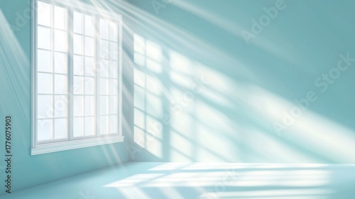Sunlight streams into a serene, empty room with light blue walls and a white window frame.