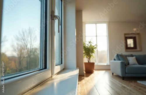 Sunlight streams through large window panes illuminating modern living room with grey sofa. Potted plant sits near window with trees outside. Peaceful home interior view.