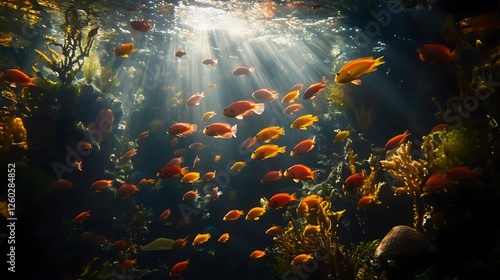 Sunlit aquarium fish school, vibrant coral, underwater scene, peaceful nature