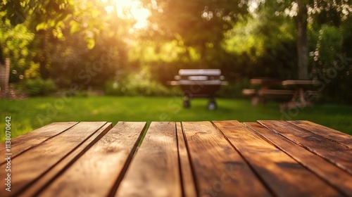 Sunlit backyard scene featuring a wooden table and BBQ grill with a blurred background of greenery and warm sunlight during golden hour