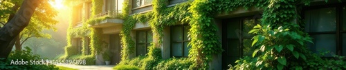 Sunlit building, vibrant green ivy climbing walls, summer, building, wall