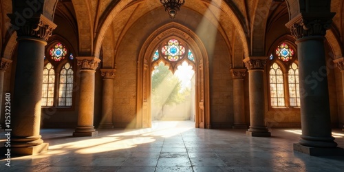 Sunlit Cathedral Hallway with Ornate Columns and Stained Glass Windows