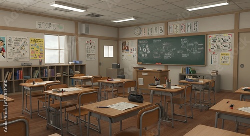 Sunlit empty Japanese school classroom with wooden desks and blackboard, evoking memories of education and learning