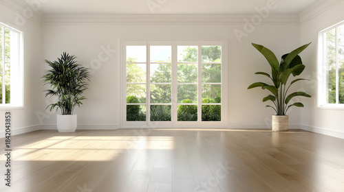 Sunlit empty room with wooden floor and large window creating calm atmosphere