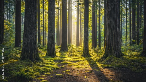 Sunlit Forest Path Among Tall Trees And Moss