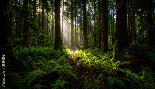 Sunlit Forest Path Lush Green Canopy Sunlight Beams