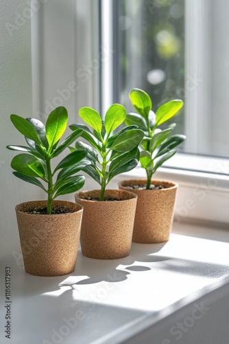 Sunlit green plants in eco-friendly pots on windowsill