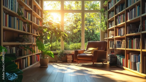 Sunlit home library with tall wooden shelves, colorful books, and comfortable seating, creating a peaceful, cozy reading space.