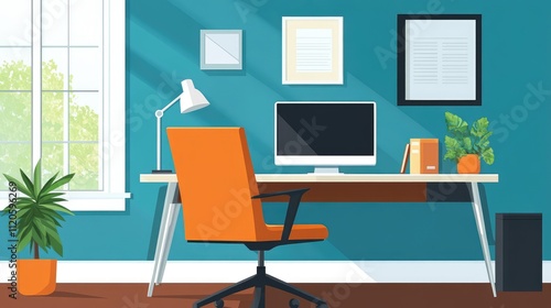 Sunlit home office with desk, chair, computer, and plants.