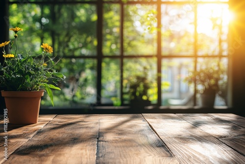 Sunlit Indoor Garden with Potted Flowers on Wooden Table Near Large Windows