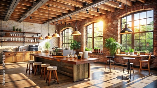 Sunlit Industrial Cafe Interior Design with Wooden Accents and Abundant Natural Light