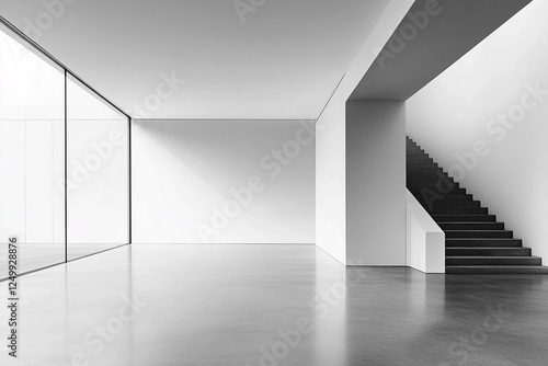 Sunlit Minimalist Interior with Concrete Walls and Staircase Featuring Clean Lines