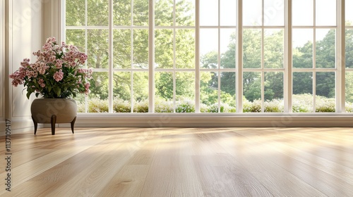 Sunlit room with flowers, hardwood floor, and large window overlooking a garden.