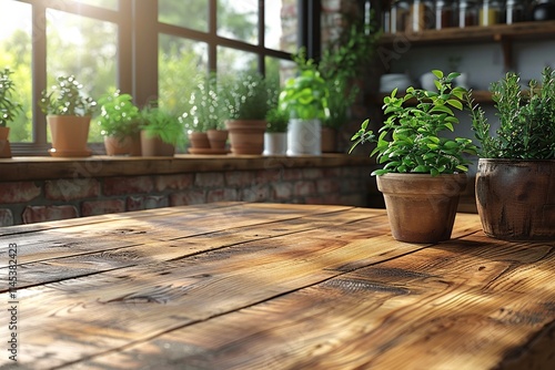 Sunlit rustic kitchen table with potted herbs. Warm, inviting, and perfect for cooking.