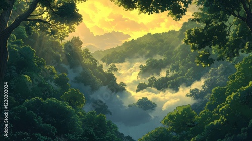 Sunlit Valley Misty Forest Scene Golden Hour Tranquility