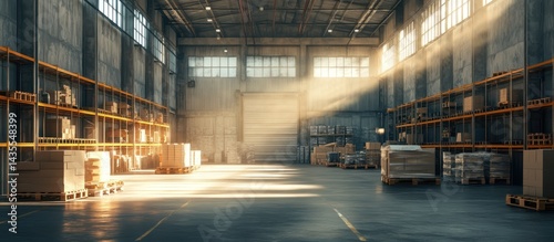Sunlit warehouse interior, pallets stacked high, distribution center background, logistics