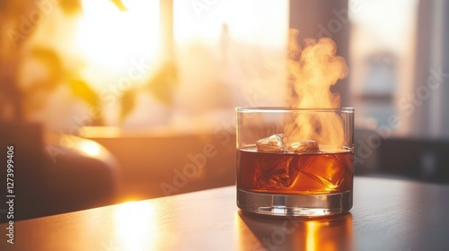 Sunlit whiskey glass, ice cubes, smoky vapor, cozy atmosphere, golden glow, tranquil moment, warm ambiance, evening relaxation.