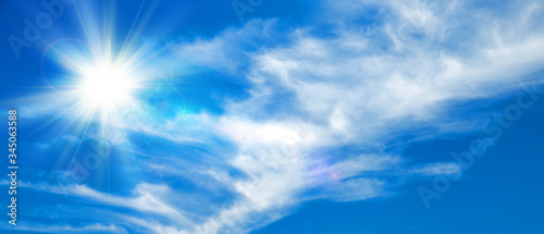 Sunny background, blue sky with white clouds and sun