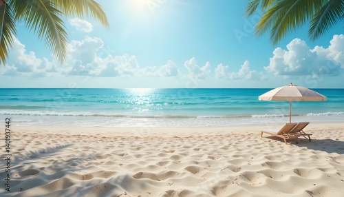 Sunny Beach Relaxation with Lounger and Umbrella: A tranquil scene of a white sandy beach with gentle turquoise waves under a bright sun and blue sky with scattered clouds, featuring a lone lounge