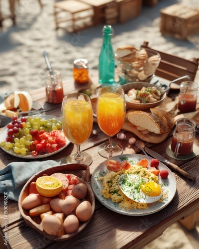 Sunny Beachside Breakfast Table with Scrambled Eggs and Fresh Fruit