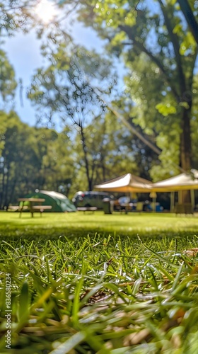 Sunny Camping Field with Canopy Tent and Grass Texture
