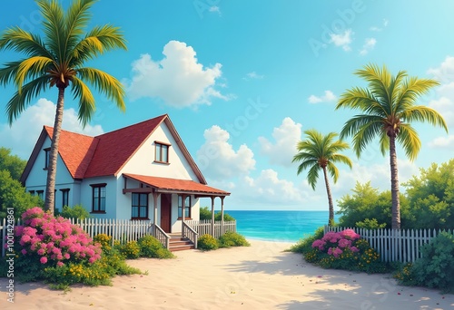 Sunny day on a tropical beach. Big rocks. Calm waves. Clear sky. Bright warm colors. The beauty of the sea. Seascape, work of art. Vector illustration design
