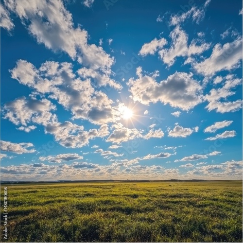 Sunny day over a vast, grassy plain. Fluffy clouds dot a vibrant blue sky. Sunlight shines brightly