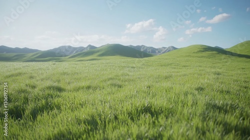Sunny grassland, rolling hills, peaceful landscape, background mountains, nature website