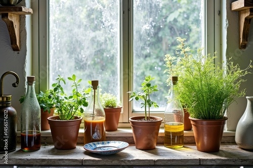 Sunny kitchen herb garden with potted plants and glass bottles by window
