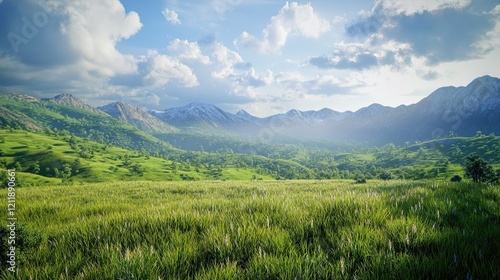 Sunny mountain meadow landscape, idyllic scene, travel, nature background, postcard