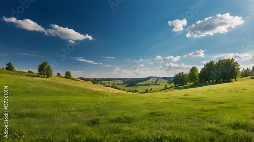 Sunny Summer Background with Clear Blue Sky and Lush Green Meadow – Bright Tranquil Landscape for Seasonal Ads, Nature Blogs, Countryside Themes, and Outdoor Branding