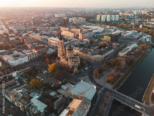 Sunny sunset aerial view above river Lopan embankment near Annunciation Cathedral in Kharkiv, Ukraine. Autumn cityscape, city streets