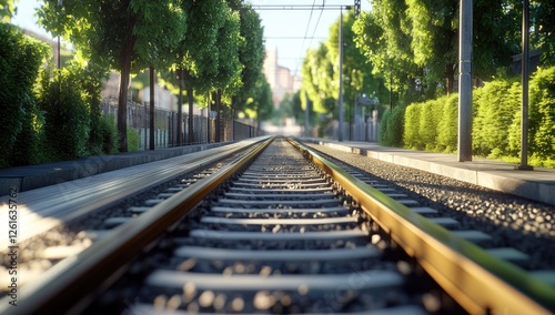 Sunny urban train tracks perspective through green trees
