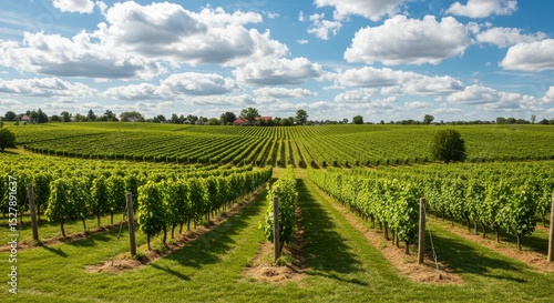 Sunny Vineyard Landscape in Summer - Picturesque vineyard rows under a vibrant blue sky with fluffy white clouds. Symbolizing nature, growth, harvest, tranquility, and abundance