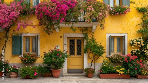 Sunny yellow house with blooming flowers, warm summer charm