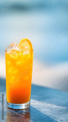 Sunrise orange juice with ice and lemon, relaxing vibe and clear margin for lifestyle caption