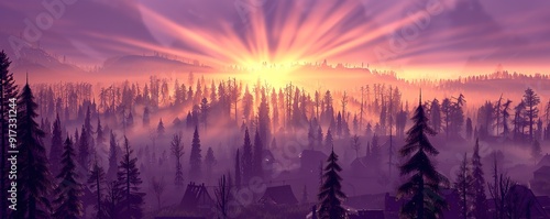Sunrise over a misty forest with a purple hue. Perfect for nature, tranquility, and morning themes.