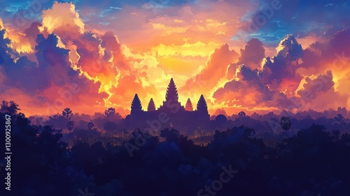 Sunrise over Angkor Wat, with its iconic spires silhouetted against the vibrant sky