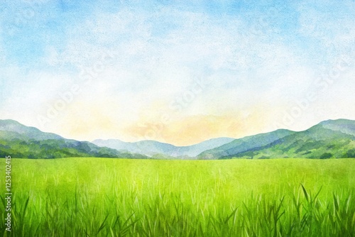 Sunrise Over Lush Green Field in Watercolor Style