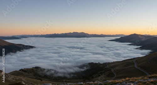 Sunrise over mountainous valley covered in clouds