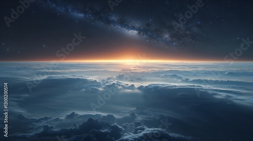 Sunrise over the earth with dramatic clouds and sunlight casting a colorful glow on the horizon