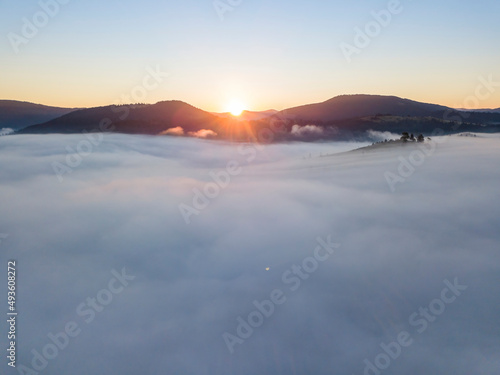 Sunrise over the fog in the Ukrainian Carpathians. Aerial drone view.