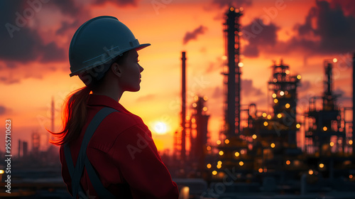 Sunrise shift strategy: a female maintenance engineer reviews the day's tasks, her hard hat a symbol of leadership in the predawn light of the industrial site. Industrial. Illustration