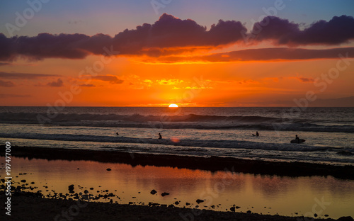 Sunset Background Ocean. Tropical Sunlight and Summer Sunset View. Colorful Background Sunset. Blue Waves near sea Resort. Sea sunset Background. Colorful Beach with Surfers on the Horizon. Landscape