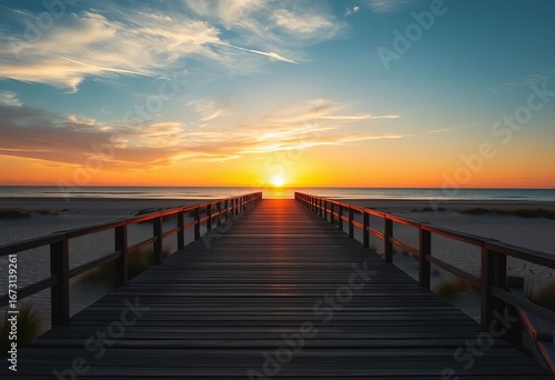 Sunset casts long shadows across an empty wooden boardwalk leading to a sandy beach, sky, wood