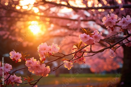 Sunset Elegance: The sky is painted with hues of orange and pink as the setting sun bathes the garden in warm light. Cherry blossoms stand out against the twilight.