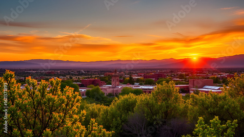 Sunset in Santa Fe, New Mexico skyline with golden hour light on green foliage summer plants and cityscape buildings with mountains silhouette
