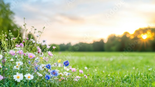Sunset meadow wildflowers peaceful park landscape, nature serenity