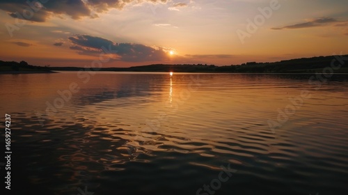 Sunset Reflection on a Calm Lake with Distant Hills