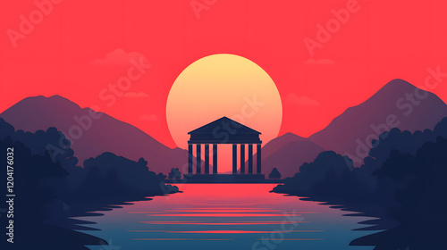 Sunset reflection on ancient temple by river in mountainous landscape digital art